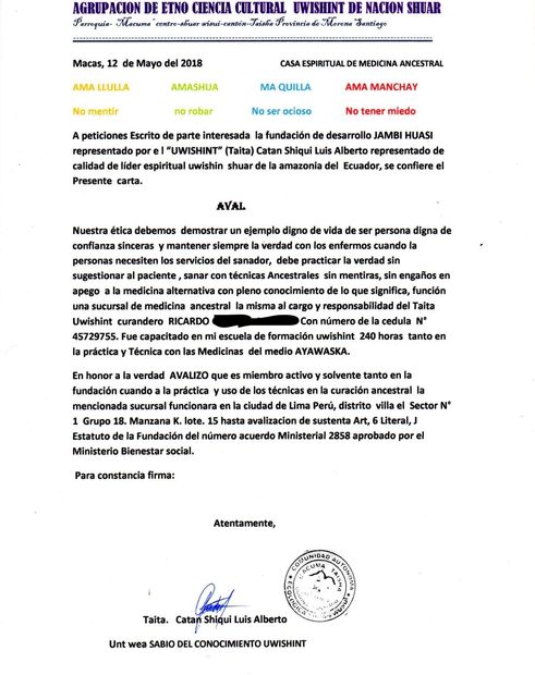 ... Ricardo left Iquitos to continue his apprenticeship. He found an amazingly powerful Maestro in Ecuador where he received a very strong preparation with Ayahuasca and other plants. Maestro Luis Alberto Catan Shiqui is a shaman, who dedicated his life to all types of studies with plants from the equatorial Amazon.